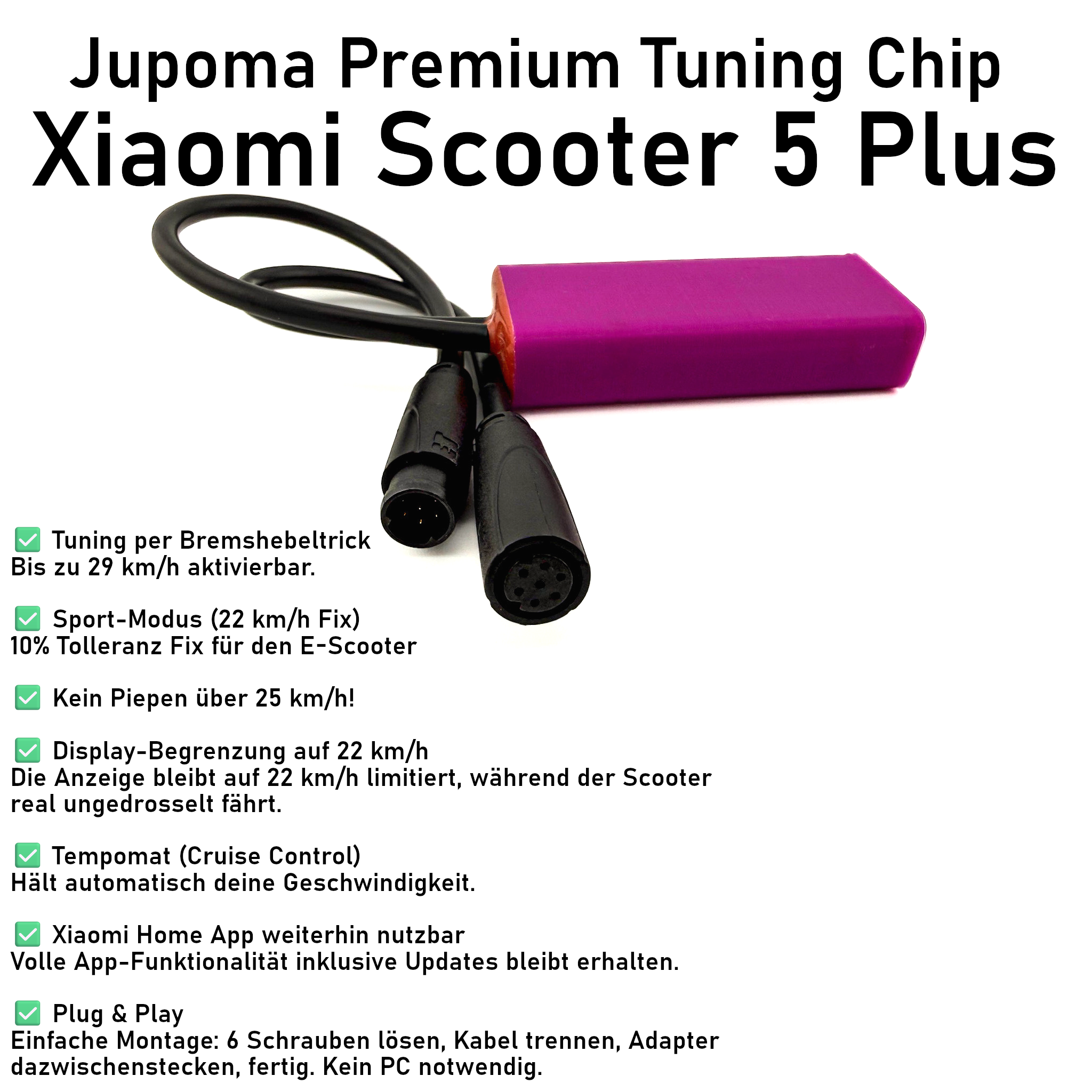 Tuning-Chip für den Xiaomi 5 Plus für bis zu 29kmh! Speziell für Deutschland entwickelt – der Adapter ermöglicht die per Tastenkombination den Scooter auf 29kmh zu tunen und erweitert den originalen Funktionsumfang um 22-km/h-Patch und Tempomat.